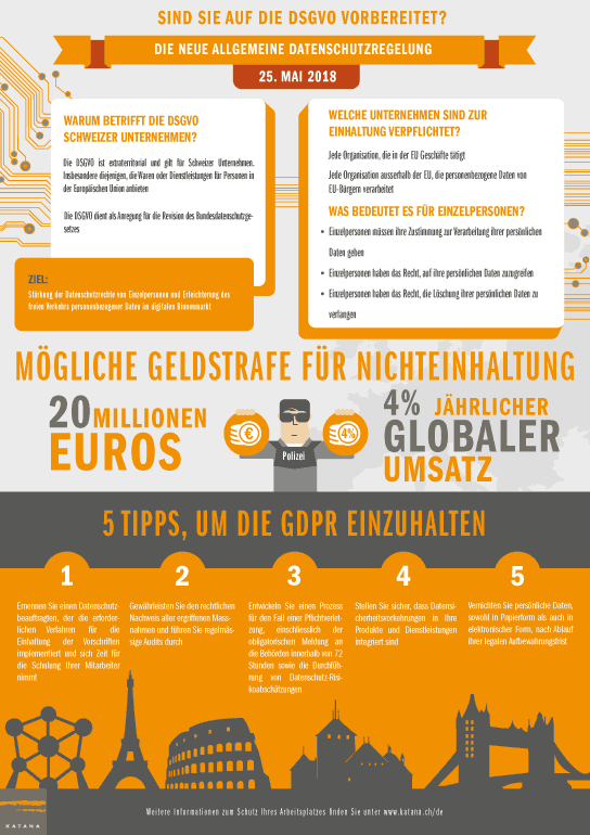Eine Infografik, die die Auswirkungen der neuen Europäischen Datenschutzverordnung (DSGVO) erläutert. Die Infografik zeigt auf, was die neue Gesetzgebung vorsieht, die betroffenen Unternehmen und grundlegende Massnahmen zur Vorbereitung auf die geplante Umsetzung am 25. Mai 2018.