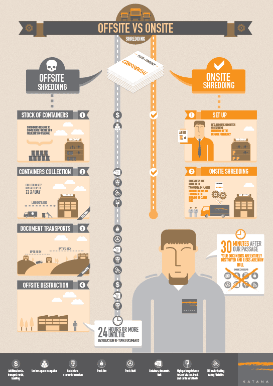 A comparative infographic puting emphasis on the risks that occur while shredding confidential documents off-site and the advantages of the on-site shredding solution offered by Katana.